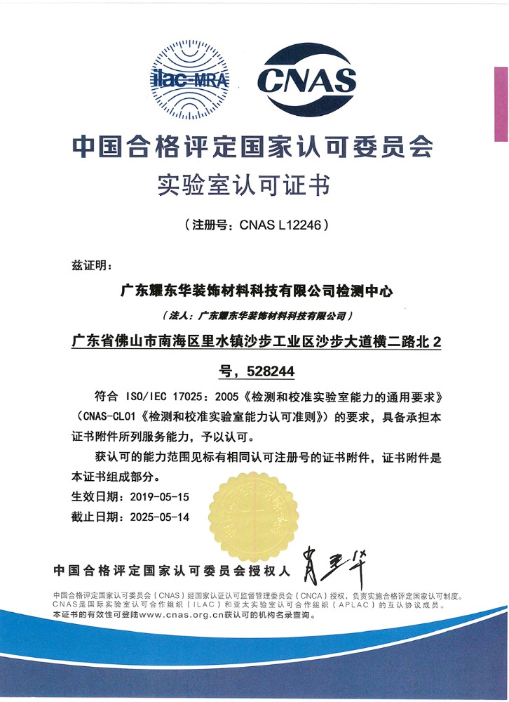表明耀东华的实验室具备了按有关国际认可准则开展检测和(或)校淮服务的技术能力,向客户提供的测试/校准服务可以声称是符合国际标准要求的,对板材等产品的检测结果得到国内和国际上的承认。