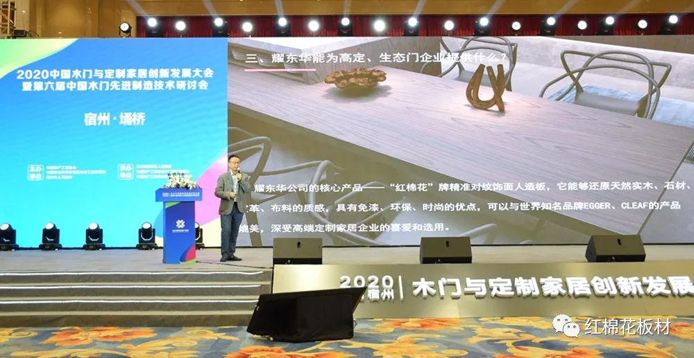 2020年10月17日,2020中国(宿州)木门与定制家居创新发展大会暨第六届中国木门先进制造技术研讨会,在安徽宿州隆重开幕,耀东华公司董事长曾敏华先生受邀出席,作《高端饰面人造板助推高端定制和生态门业发展》主题报告,并参与嘉宾访谈,分享耀东华公司在围绕产业高质量发展与产业链协同创新方面的实战举措和实践经验。